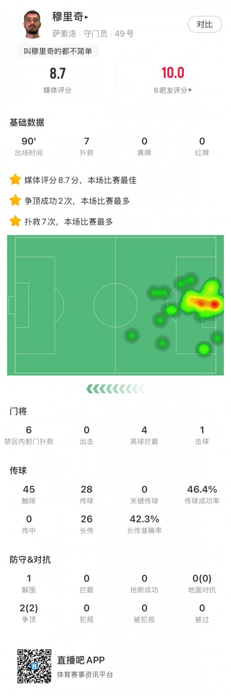 阿里贾尼特·穆里奇全场贡献7次扑救,其中禁区内射门扑救6次,还有4次高球拦截,1次击球1次解围,赢得2次争顶。
