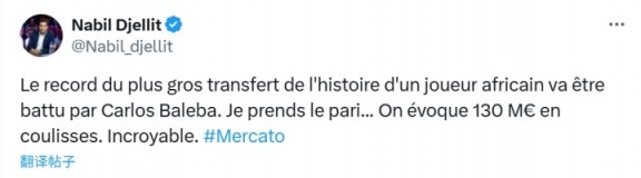 记者在社媒写道:非洲球员历史最高转会费纪录即将被巴莱巴打破,我敢打赌!据悉幕后讨论的转会费高达1.3亿欧元,太疯狂了。