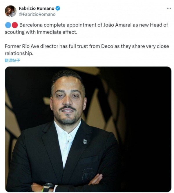 罗马诺:阿马拉尔出任巴萨球探主管,德科对他非常信任
