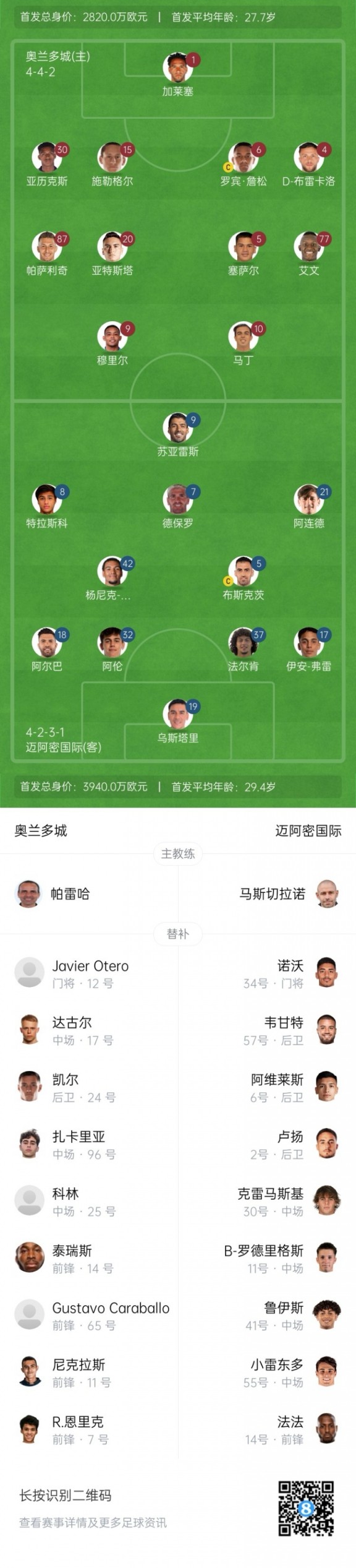 奥兰多城首发:1-加莱塞、15-施勒格尔、6-罗宾-詹松、30-亚历克斯、4-D-布雷卡洛、20-亚特斯塔、5-塞萨尔、87-帕萨利奇、77-艾文、9-穆里尔、10-马丁