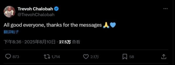 查洛巴写道:“一切安好,感谢大家的留言