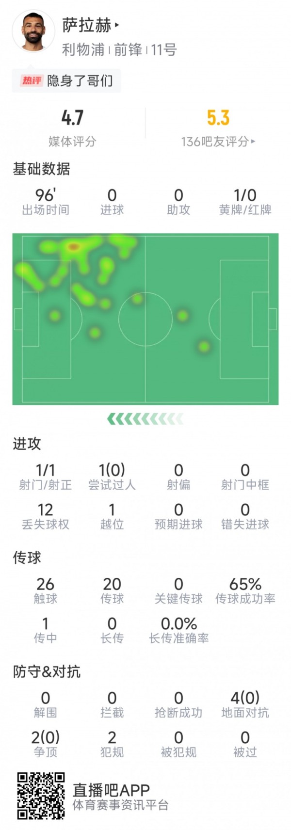 迷失!萨拉赫本场数据:1射门,关键传球&成功对抗挂零,罚失点球