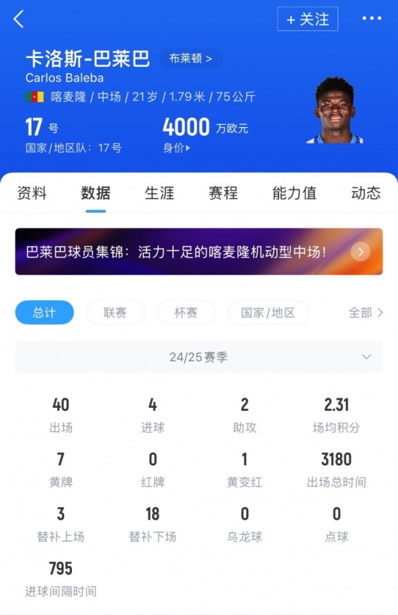 巴莱巴上赛季各赛事为布莱顿出场40次,贡献4球2助,这位21岁的喀麦隆中场目前德转身价为4000万欧元。